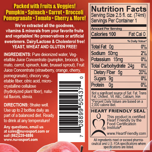 - Delivers 5 servings of fruits and vegetables in a single “shot” – made from over 12 fruits & veggies